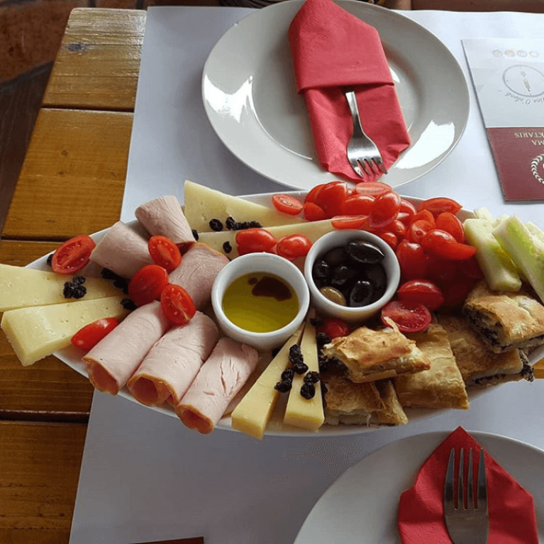 1. Wine tasting with platters: Tasting of 4 different labels accompanied by platters with variety of cheese and cold ham, spinach pie with feta cheese, stuffed grape leaves with rice and herbs, cherry tomatoes with cucumber and olives, olive oil, bread etc. At the end of the tasting we serve a semi sweet dessert wine. The price is 15 euros per person. (It needs a reservation at least 24 hours before).